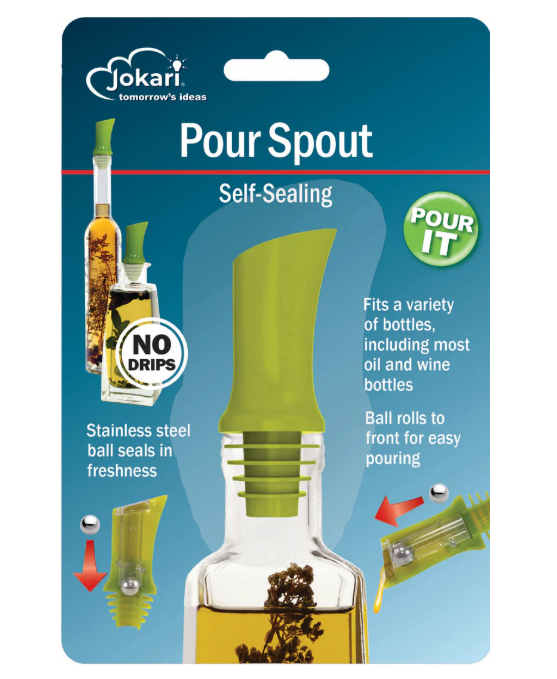 To prevent that, I love this new gadget, the Jokari Self-Sealing Pour Spout! It attaches to any bottle with a wine bottle size opening, and it has this really cool mechanism that seals it when it’s upright and pours when tilted.